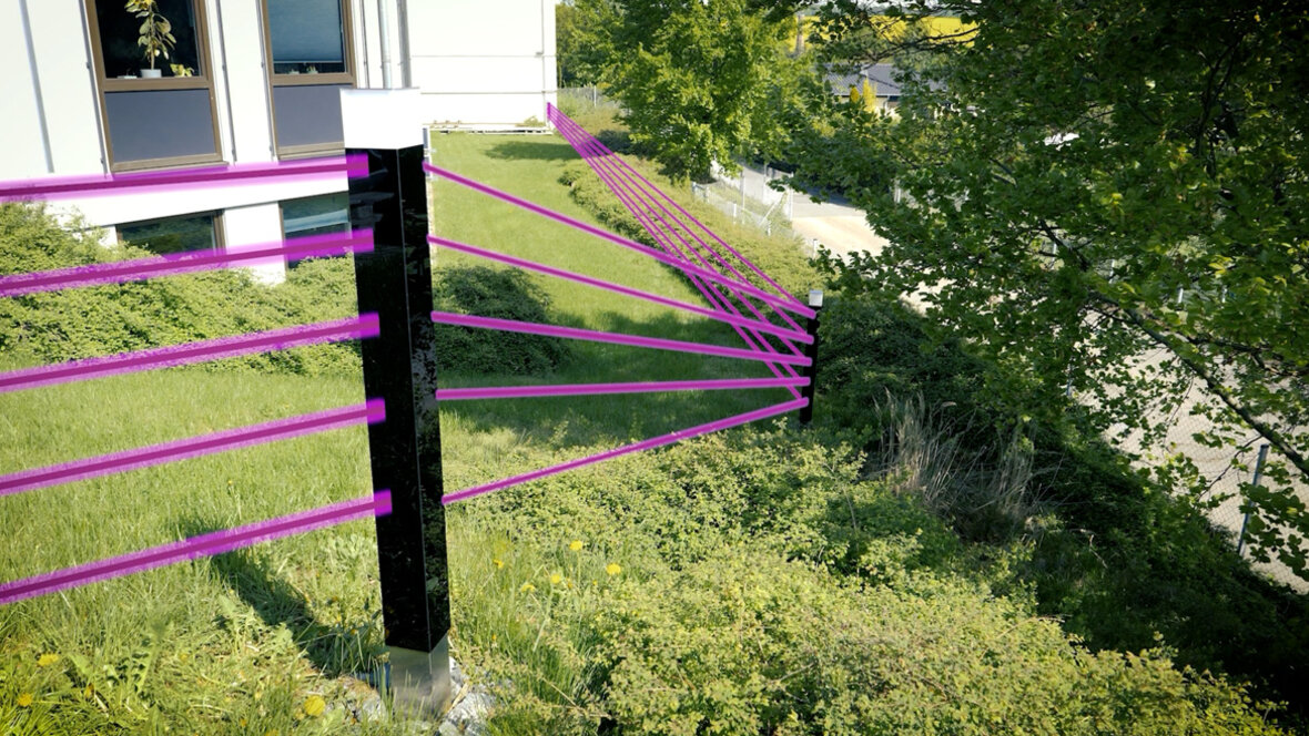 Die Anlage sendet unsichtbare Infrarotstrahlen zwischen zwei Säulen. Sobald diese unterbrochen werden, löst die Alarmanlage aus.
